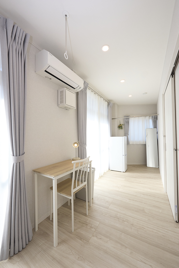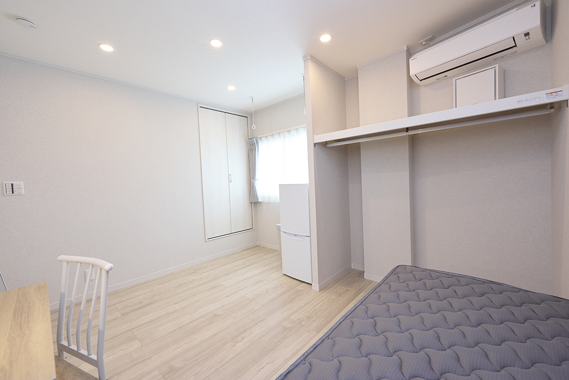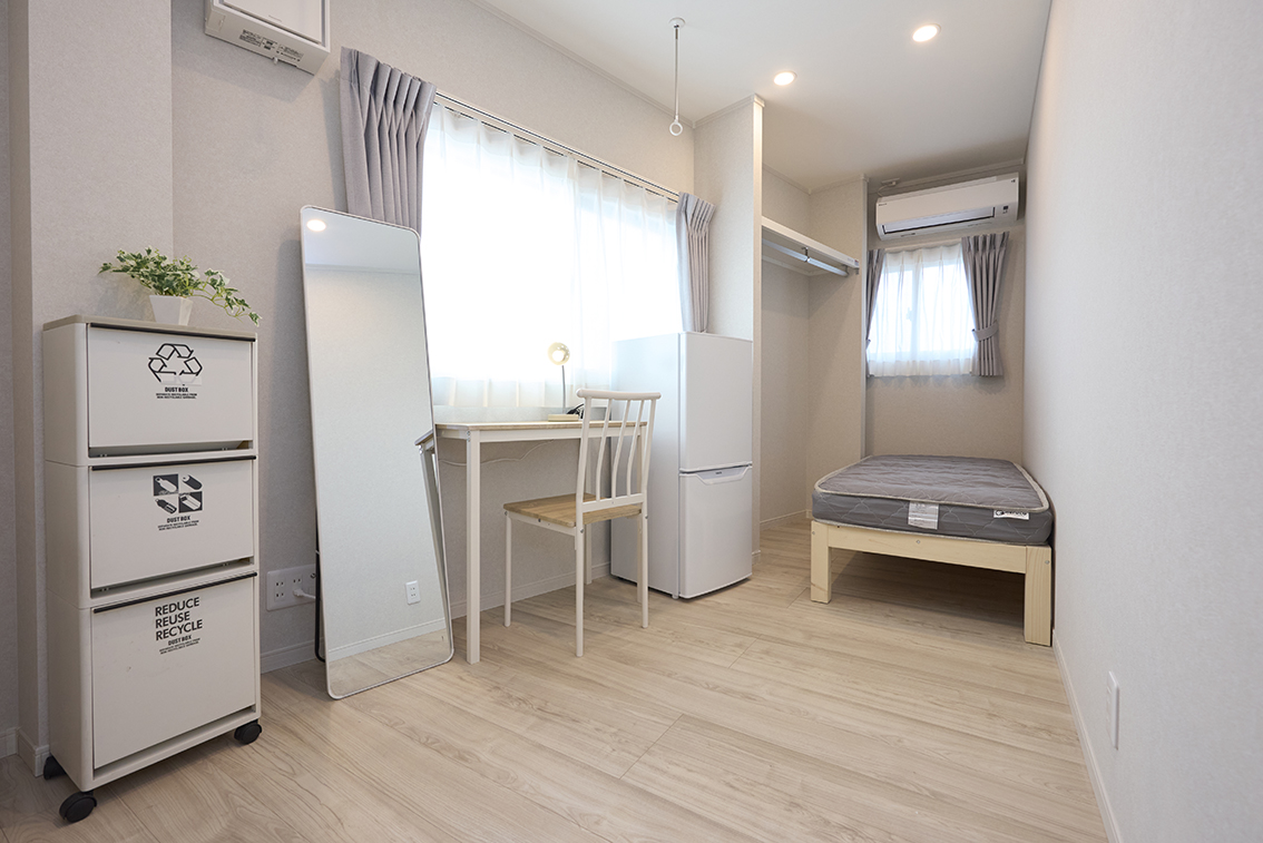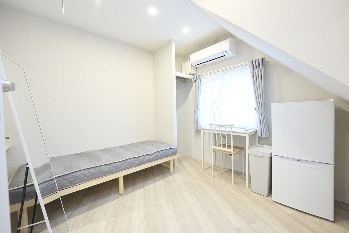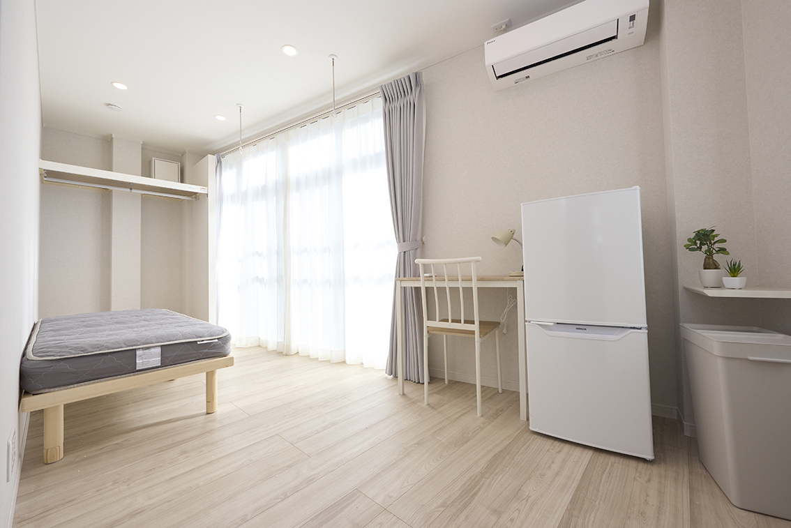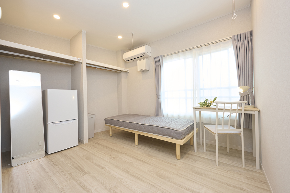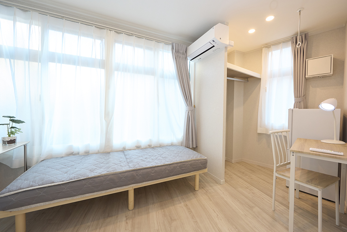 ベッド、デスク、チェア、ミニライト、エアコン(無料)、ゴミ箱、ネット(無線)その他条件