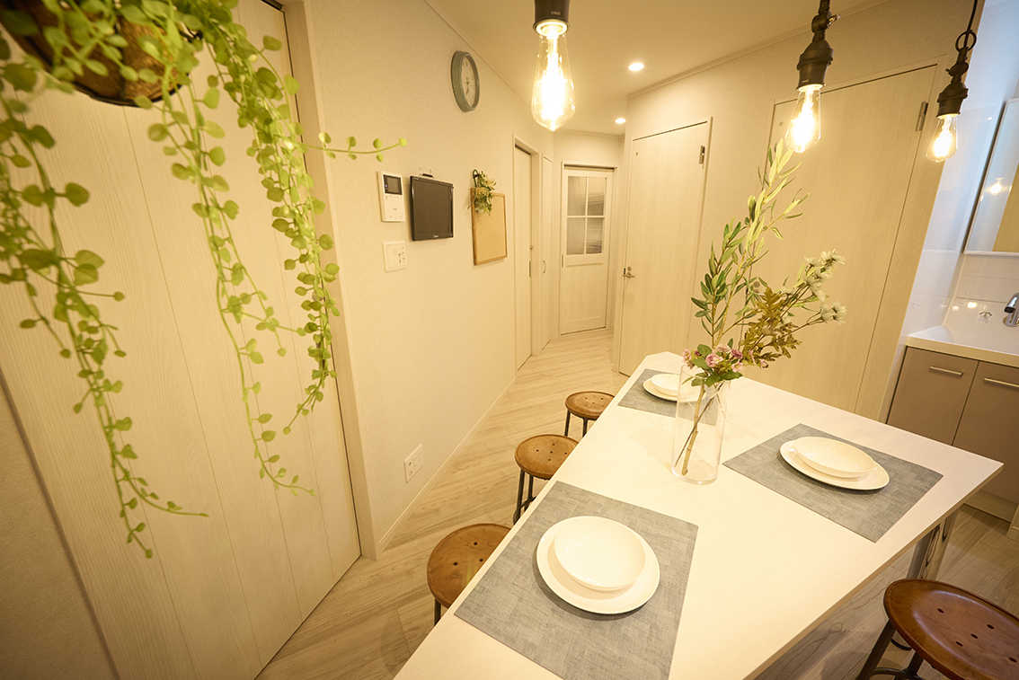 キッチン、ダイニング、トイレ(2室)、お風呂(1室・無料)、洗濯機(2台・無料) 乾燥機(2台・無料)、TV(1台)、エアコン(無料)・掃除機・アイロン・調理器具・食器完備、カメラ付きインターホン、宅配ボックス個室内設備